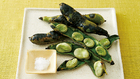 そら豆は魚焼きグリルに並べ、強火で黒い焦げ色がつくまで両面を焼く。器に**1**を盛り、塩少々を添える。粗熱が取れて触れる程度になったらさやを外し、塩をつけて薄皮ごと食べる。