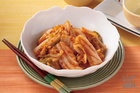 ひじきはサッと湯通しして水けをきっておく。セロリは筋を取り、2.5cm長さの細切りにする。ベーコンは4cm長さに切る。フライパンにサラダ油小さじ2を熱し、セロリをいためる。透き通ってきたらひじきを入れてさらにいため、【A】を入れて中火で煮る。煮汁が半分ほどになったらベーコン、ねぎを入れて、煮汁がなくなるまで火を通す。 ・ひじき 100g・セロリ 100g・・・・ 調理時間:約15分 カロリー:約110kcal