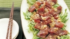 まぐろは薄いそぎ切りにする。水菜は5cm長さに切る。バットにねぎ塩だれ大さじ2を入れ、にんにくを加えて混ぜる。**2**にまぐろを加えて全体にからめ、10分間ほどおく。器に水菜を盛り、**3**のまぐろをのせ、残りのねぎ塩だれをかける。 ・まぐろ 1さく・水菜 1/2ワ・ねぎ塩だれ 大さじ3・にんにく 1/2かけ分 調理時間:約5分 カロリー:約140kcal