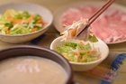 (1)小鍋にAを入れて火にかけておく。(2)耐熱容器にもやしを入れ、ラップをかけて電子レンジ(600W)で2分加熱し、「レンジで簡単!キャベツナムル」を合わせ、器に盛る。(3)(1)が沸騰したら、豚肉をサッとくぐらせて、火を通し、(2)のナムルを巻いていただく。*底の面積が広い鍋で調理する場合は、「鍋キューブ」と水の量を増やして調節してください。 豚しゃぶしゃぶ・・・ カロリー:約200kcal