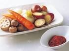 野菜はすべてよく洗い、皮つきのまま蒸気の上がった蒸し器で15分間ほど蒸し(または、柔らかくなるまでゆでてもよい)、それぞれ好みの大きさに切る。**1**を器に盛り、[[キムチヤンニョム|rid=7919]]を添える。 ・かぶ 2~4コ・れんこん 1節・にんじん 1~2本・さつまいも 1本・里芋 4コ・小たまねぎ 4コ・キムチヤンニョム 大さじ2~3 調理時間:約20分 カロリー:約150kcal