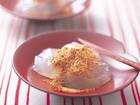 【わらびもち】をつくる。わらび粉と砂糖を合わせ、水をカップ1ずつ加えてよく溶く。こしてなべに入れて中火にかけ、木べらで透明感が出るまでよく練る。大きめのボウルに冷水を入れ、**1**を熱いうちにスプーンですくって入れ、冷やす。全部入れ終わったら一度水を入れ替える。きな粉と砂糖を混ぜ合わせる。**2**の水けをきって器に盛り、**3**をかける。 ・わらび粉 100g・砂糖 50g・水 カップ2+3/4・きな粉 大さじ4・砂糖 大さじ2強 調理時間:約15分 カロリー:約720kcal