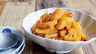 れんこんは大きめの乱切りにする。10分間ほど水にさらし、水けをきる。【A】は混ぜ合わせておく。フライパンにごま油大さじ1を強めの中火で熱し、**1**のれんこんを炒める。表面が透き通ってきたら【A】をもう一度混ぜて回し入れ、中火にし、時々混ぜながら5分間ほど煮る。汁けがほとんどなくなり、表面に照りが出たら火を止める。 ・れんこん 2~3節・酢 カッ・・・ 調理時間:約15分 カロリー:約560kcal 塩分:約5.7g