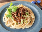 肉味噌を作る。フライパンに油、にんにく、しょうがを入れて弱火で炒める。にんにくとしょうがの香りがしてきたら豚ひき肉を入れて炒める。豚挽き肉に火が通り、ポロポロになったら酒を入れる。アルコールが飛んだらAで味付けして火を止める。鍋に湯を沸かし、冷凍うどんをゆでる(茹で時間は商品パッケージ参照)。ざるにとり湯を切ったら2等分して器に盛る。よ・・・ 調理時間:約20分 カロリー:約464kcal 塩分:約2.3g