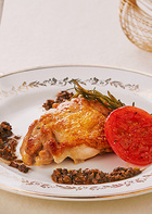 下準備 鶏肉は余分な水気・脂肪を除き、厚みを均一に開いて半分に切り、《a》で下味をつけておく。 1. ボウルに《b》を入れよく混ぜる。 2. フライパンにオリーブオイル(小さじ1/2)を熱し、トマトを入れ、両面に焼き色をつけ、塩・黒こしょうをふって取り出す。 3. フライパンの粗熱を取り、にんにく・ローズマリー・オリーブオイル(小さじ1)を入れ加熱する(弱火)。香・・・ 調理時間:約30分 カロリー:約421kcal