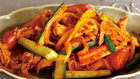 たまねぎは縦に薄切りにする。パプリカはヘタと種を取り、縦に5mm幅くらいに切る。きゅうりは両端を切って長さを4等分に切り、それぞれ六つ割りにする。トマトはヘタを取り、8等分のくし形に切る。豚肉は3等分に切る。