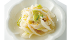 塩もみ白菜1/3量(約200g)は水けを絞り、5~6cm長さに切る。ボウルに酢大さじ4、砂糖・水各大さじ2、ごま油大さじ1、ラーユ・しょうが(せん切り)各少々を混ぜ合わせ、塩もみ白菜を加えて混ぜる。