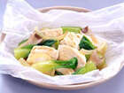 玉ねぎは5mm幅に、チンゲン菜は一口大に切り、エリンギは縦薄切りにする。カジキマグロは塩少々をふる。大きめのクッキングシートにSTEP1をのせ、酒をふり、バターをのせ、折りたたむようにしてしっかりと包む。耐熱皿にSTEP2をのせ、電子レンジで5分前後加熱し、火を通す。"食べる直前にシートを開き、「ヤマサ昆布ぽん酢」をかける。 カジキマグロ80g玉ねぎ30gチンゲン菜25gエリンギ25g酒10mlバター5gヤマサ昆布ぽん酢またはヤマサ昆布ぽん酢 スーパーマイルド適宜 調理時間:約15分 カロリー:約172kcal 塩分:約1.5g