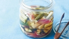 沸騰したら野菜をすべて加え、ひと混ぜして火を止める。ボウルかバットに汁ごとあけ、ラップを表面にぴったりとつくようにかける。完全に冷めたら食べられる。 ・セロリ 1本・きゅうり 2本・みょうが 3コ・水 カップ1/2・酢 カップ1/2・砂糖 カップ1/4~1/2・塩 小さじ1+1/2・ローリエ 1枚 調理時間:約10分 カロリー:約90kcal 塩分:約2.3g
