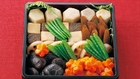 裏白を敷き、いちばん奥側に里芋の断面を上にして、隙間なく立てて並べる。ごぼう、れんこんは、断面が見えるように方向をそろえ、斜めに立てて並べる。手前側に黒いしいたけ、赤いにんじんを詰めると、色合いがぐっと締まる。