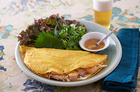 生地の半分に(表面が乾いてきたら)もやし、2のえび、豚肉の1/4量をのせてふたをし、弱火にして、生地の縁に焼き色がつくまで2分ほど焼く。サラダ油小さじ1を鍋肌から回し入れる。こ 豚バラ薄切り肉 100gむきえび 200gもやし 200gサラダ油 適量塩 少々こしょう 少々薄力粉 1カップ米粉 1/4カップターメリック 小さじ1塩 小さじ1/4ココナッツミルク 250ml水 1/2カップにんにく(みじん切り) 小さじ1/2ナンプラー 大さじ2レモン汁 大さじ2水 大さじ2砂糖 大さじ1サニーレタス 8枚青じそ 8枚香菜(ざく切り) 適量