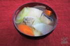 材料 [ 2人分 ]「活ちくわ」2本だいこん1/5本にんじん(小)1/2本しゅんぎく1/4束みそ大さじ1すりごま適宜だし汁1・1/2カップ 調理時間:約10分 カロリー:約83kcal 塩分:約1.8g ニッスイ レシピ