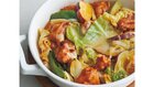 鶏もも肉 350g。キャベツ(一口大に切る) 1/4個。たまねぎ(1cm幅の半月切り) 1個。にんじん(短冊切り) 1/2本。切り餅(縦3等分に切る) 2個。