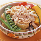 蒸し器に湯を沸かし蒸気が上がったら、かぼちゃ、じゃがいもを入れ蓋をして蒸す。竹串がジャガイモに刺さるくらいになったら、残りのパプリカとスナップエンドウを加え、さらに2〜3分蒸す。液を切ったとりささみフレークにマヨネーズを加えてあえる。お好みで粒マスタードを加えてもOK。蒸しあがった野菜を器に盛り、3のチキンマヨをかける。 いなば とりささみフレーク 1缶かぼちゃ 1/8個じゃがいも 小〜中 4個スナップエンドウ 6個パプリカ 1個マヨネーズ 適量粒マスタード(お好み) 適量 調理時間:約20分