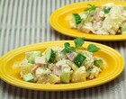 じゃがいも 大1個(200g)、ハム 2枚、きゅうり 1/3本、たまねぎ (スライス) 1/4個分、塩 ひとつまみ、、、マヨネーズ 大さじ3、ミツカン いいこと酢 小さじ2、ブラックペッパー 少々 カロリー:約228kcal 塩分:約1.1g ミツカン メニュー・レシピ