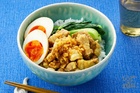 チンゲン菜はタテ半分に切り、長さを半分に切って、ラップで包み、電子レンジ(600W)で1分加熱する。(2)鍋に(1)の豚肉・たくあん漬け・ねぎ・しょうが、Aを入れて火にかけ、15分ほど汁気がなくなるまで煮る。途中、8分経ったら、ゆで卵を加えて、卵を転がしながら煮る。(3)丼にご飯をよそい、(2)の豚肉を盛り、(1)のチンゲン菜、タテ半分に切った(2)のゆで卵をのせる。 豚バラかたまり肉 200gたくあん漬け 2切れ長ねぎ 10cmしょうが 8gA水 1/4カップAしょうゆ 大さじ1・1/3A酒 大さじ1A酢 大さじ1A砂糖 大さじ1/2Aカレー粉 小さじ1/3A「うま味だし・ハイミー」 3ふりチンゲン菜 1株ゆで卵 2個ご飯 400g カロリー:約786kcal