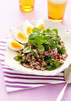 スペアミントは堅い軸を取り除く。にんにくはみじん切りにする。赤唐辛子はへたと種を取り除き、5つ~6つにちぎる。小さい器にAの材料を混ぜ合わせる。ゆでは殻をむき、4等分のくし形に切る。フライパンにサラダ油小さじ1、にんにく、赤唐辛子を入れて弱火で熱し、香りが出たらひき肉を加えて、中火で、ほぐしながら2~3分炒め、肉に火が通ったら火を止める。A、【1】のミントの1/2量を加えて混ぜ合わせる。器に盛り、残りのミントをのせ、ゆでを添える。