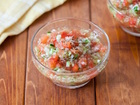 きゅうり、玉ねぎ、にんにくはみじん切りにする。トマトは5mm角ほどに切る。ボウルに、STEP1、「ヤマサ ぱぱっとちゃんと これ!うま!!つゆ」、水、パン粉を入れて混ぜ、器に盛る。黒こしょうをふる。 トマト1個きゅうり1/2本玉ねぎ1/2個パン粉大さじ1ヤマサ ぱぱっとちゃんと これ!うま!!つゆ小さじ2水120ml黒こしょう適量 調理時間:約10分 カロリー:約48kcal 塩分:約0.5g