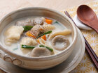 1Aの小麦粉と水を練り合わせて、粉っぽさがなくなるまでよくこねて、ひっつみを作る。2里いもは1cmの厚さ、にんじんは5mmの厚さのいちょう切り。ごぼうは5mmの小口切りにする。青ねぎは3cmに切る。3鍋に2の根菜類と豆乳、水を入れて火にかける。沸騰したら弱火にし、5分ほど煮たらつみれを入れて2、3分煮る。41のひっつみを、ひっぱって3の中に入れ、塩、薄口しょうゆを入れて味を調えながら煮る。ひっつみがやわらかくなったら火を止める。 カロリー:約143kcal 塩分:約2.7g