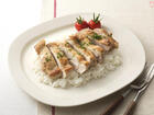 1フライパンにオイルソースを入れて火にかけ、鶏もも肉を焼き、食べやすい大きさに切る。2器にご飯を盛りつけ、①をのせ、フライパンに残った肉汁をかける。3②にみじん切りにしたパセリを散らし、ミニトマトを添える。