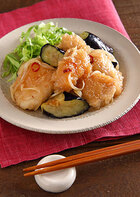 下準備 ・鶏むね肉はフォークで穴を開け、ひと口大に切る。ビニール袋に鶏肉・aを入れ、もみこんで下味をつけておく(5分〜)。 1.耐熱容器に玉ねぎ・bを入れ、ラップをふんわりとかける。電子レンジで加熱し(600W3分)、粗熱を取る。 2.鶏肉の余分な水分を拭き取り、片栗粉をまぶす。 3.フライパンにサラダ油を熱し、余分な片栗粉をはたいた2を入れ、揚げ焼きする(中火5〜6分、焼き色がついたら裏返して2分)。火が通ったら1に漬け込む。 4.同じフライパンを熱し、なすを皮を下にして入れ、途中で裏返しながら焼く(強めの中火3分)。