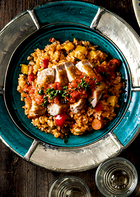 ・鶏肉は余分な脂肪・水気を除き、厚 みを均一にして半分に切り、塩・黒こ しょうで下味をつけておく。 ・《c》は混ぜ合わせておく 1. 鍋にオリーブオイル(大さじ1/2)・にんにくを入れて熱し(弱火)、香りが出たら玉ねぎを加え、しんなりとするまで炒める(中火)。 2. 米・ウインナーを加えて炒める(弱火 約1分)。 3. 《b》を加えて混ぜ、《a》をのせ、フタをして加熱する(強火)。沸騰したら弱火にして炊き(約20分)、蒸らす(10分~)。 4. フライパンにオリーブオイル(小さじ1/2)を熱し、鶏肉を皮面から入れ、余