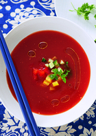 器に【1】を注ぎ、《b》をのせる。 3. エキストラバージンオリーブオイルをかけ、セルフィーユを飾る。 [a] トマトジュース(無塩) 600㏄[a] 玉ねぎ(すりおろす) 60g[a] コンソメ(顆粒) 大さじ1[a] にんにく(すりおろす) 小さじ1/4[a] 塩 小さじ1/4[a] 黒こしょう 少々 [b] きゅうり(5㎜角) 20g[b] 赤パプリカ(5㎜角) 20g[b] 黄パプリカ(5㎜角) 20gエキストラバージンオリーブオイル 小さじ1セルフィーユ 適量 調理時間:約15分 カロリー:約52kcal
