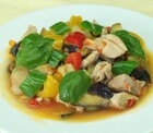 鶏肉の色が変わったら、なす以外の野菜を入れて、5分ほど丁寧に炒めて白ワインを入れる。③に②を戻し、Bを加えて15分ほど煮込み、器に盛ってバジルを散らす。 鶏もも肉1枚なす2本ズッキーニ1本パプリカ(赤・黄)各1/2個ピーマン2個玉ねぎ1/2個セロリ1/2本トマト2個バジル適量白ワイン1/4カップオリーブ油大さじ4A:赤唐辛子1本A:にんにく(みじん切り)1片B:ワインビネガー大さじ2B:砂糖ひとつまみB:オレガノ少々B:塩、こしょう各少々