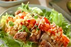 下準備6. 揚げ油を170℃に予熱し始める。 作り方1. 鶏もも肉に塩コショウして片栗粉をまぶし、170℃の揚げ油でこんがりと揚げ、食べやすい大きさに切る。 作り方2. ボウルに玉ネギ、トマト、の材料を混ぜ合わせる。 作り方3. 器にレタスをし 鶏もも肉 小2枚塩コショウ 少々片栗粉 大さじ3玉ネギ 1/2個トマト 1個カレー粉 小さじ1/2ナンプラー 小さじ2レモン汁 小さじ2オリーブ油 大さじ2塩コショウ 少々レタス 1/4個貝われ菜 1/2パック揚げ油 適量 調理時間:約20分 カロリー:約659kcal