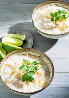 4. 【1】に《b》を加え、味をととのえる。 5. 器に【4】を盛り付け、【3】をのせ、【2】のにんにくをちらし、香菜を飾り、ライムを添える。