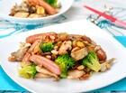 ②とThe GRAND アルトバイエルンを加えて炒める。鶏ササミを加え、Bで味を調える。器に盛り、ナッツを散らす。 The GRAND アルトバイエルン8本鶏ササミ3枚A:酒大さじ1しょうが汁大さじ1塩小さじ1/4こしょう少々片栗粉適量にんにく1片しょうが1片白ねぎ1本まいたけ1パックブロッコリー1/2個サラダ油大さじ3B:塩少々こしょう少々ごま油小さじ1ナッツ50g