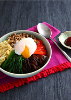 7.器にごはんを盛り、【4】・ 生きくらげ 120g牛挽き肉 50g[a] 市販のおろしにんにく 小さじ1/2[a] 酒 大さじ1[a] しょうゆ 大さじ1/2[a] 砂糖 大さじ1/2ごま油 小さじ1/2×2赤パプリカ薄切り 60gほうれん草 60g[b] 市販のおろしにんにく 小さじ1/4[b] 鶏がらスープの素 小さじ1/4[b] 塩 少々[b] ごま油 小さじ1豆もやし味付けもやし 60gごはん 300g温泉卵 2個コチュジャン 適量 調理時間:約30分 カロリー:約508kcal