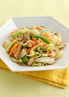 [a] 豚バラ薄切り肉(幅3㎝) 80g[a] シーフードミックス 60g[a] 塩 小さじ1/8[a] 白こしょう 少々かどやの純正ごま油 濃口 小さじ2[b] 白菜(3×4cmのそぎ切り) 200g[b] 人参(1×4cmの短冊切り) 30g[b] 椎茸(笠・軸ともに薄切り) 2枚分[b] スナップえんどう(ヘタと筋を除く) 6本[c] 水 120㏄[c] 鶏がらスープの素 小さじ1/2[c] 酒 大さじ1[c] しょうゆ 小さじ1[c] 砂糖 小さじ1/2[c] 塩 小さじ1/8[c] 白こしょう 少々[d] 水 小さじ4[d] 片栗粉 小さじ2かどやの純正ごま油 濃口 小さじ1~ 調理時間:約20分 カロリー:約285kcal