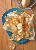 下準備 ・じゃが芋は皮付きのままよく洗っておく。 ・ボウルに水・塩(小さじ1/2)を入れておく(塩水)。 1.じゃが芋は皮付きのままスライサー(薄切り用)で薄切りにし、塩水に浸す(約10分)。 2.真水(材料外)で水に透明感が出てくるまでじゃが芋の粘りを取りながらよく洗い、ペーパーで水気を拭き取り、広げて乾燥させる(約60分)。 3.180℃の揚げ油でカラッとするまで揚げ、・・・ 調理時間:約20分 カロリー:約240kcal