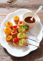 1. 豚肉は塩・黒こしょうで下味をつけ、4枚は長さを半分に切る。 2. 丸めた黄ズッキーニ・プチトマトのまわりに半分に切った【1】を巻きつける。同様に4個ずつ作る。 3. レタスは丸めて残りの豚肉をまわりに巻きつけ、横4等分に切る。 4. 金串に【2】・【3】を1種類ずつ刺し、バーベキューグリルで焼く(家で焼く場合は、予熱を入れたオーブンで加熱する〈190℃ 約10分〉・・・ 調理時間:約25分 カロリー:約297kcal