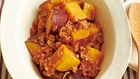さつまいもは皮付きのまま2cm厚さのいちょう形に切り、切ったはしから水にさらしておく。たまねぎはみじん切りにする。鍋にオリーブ油大さじ1を中火で熱してたまねぎを炒め、薄い茶色になったらひき肉を加えてほぐしながら炒める。トマトの水煮と水カップ3/4を加え、水けをきったさつまいもを加える。煮立ったらふたをし、弱火で10分間ほど蒸し煮にする。塩少々・・・ 調理時間:約20分 カロリー:約250kcal 塩分:約1.1g
