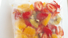 オレンジ1コ(正味約150g)は皮をむき、小房に分ける。薄皮をむいて実を取り出し、長さを半分に切る。いちご8コ(150g)は水で洗い、ふきんなどで水けをふく。ヘタを切り落とし、縦半分に切る。キウイ1コ(120g)は皮をむき、縦四ツ割りにして横に1.5cm 幅に切る(いちょう切り)。オレンジ、いちご、キウイをバットに入れ、砂糖大さじ2をふってサッとからめる。ジッパー付きの・・・ 調理時間:約15分 カロリー:約240kcal